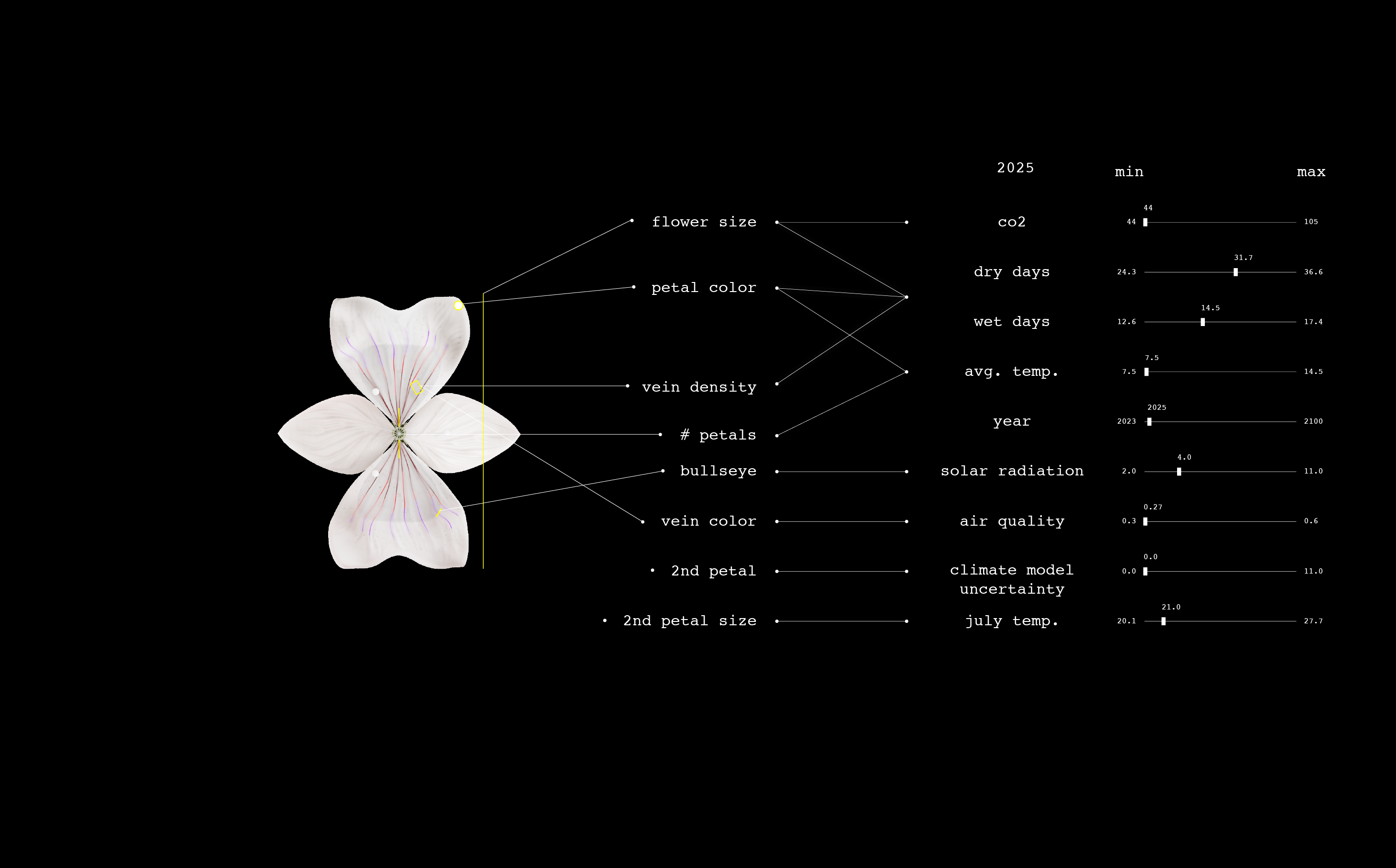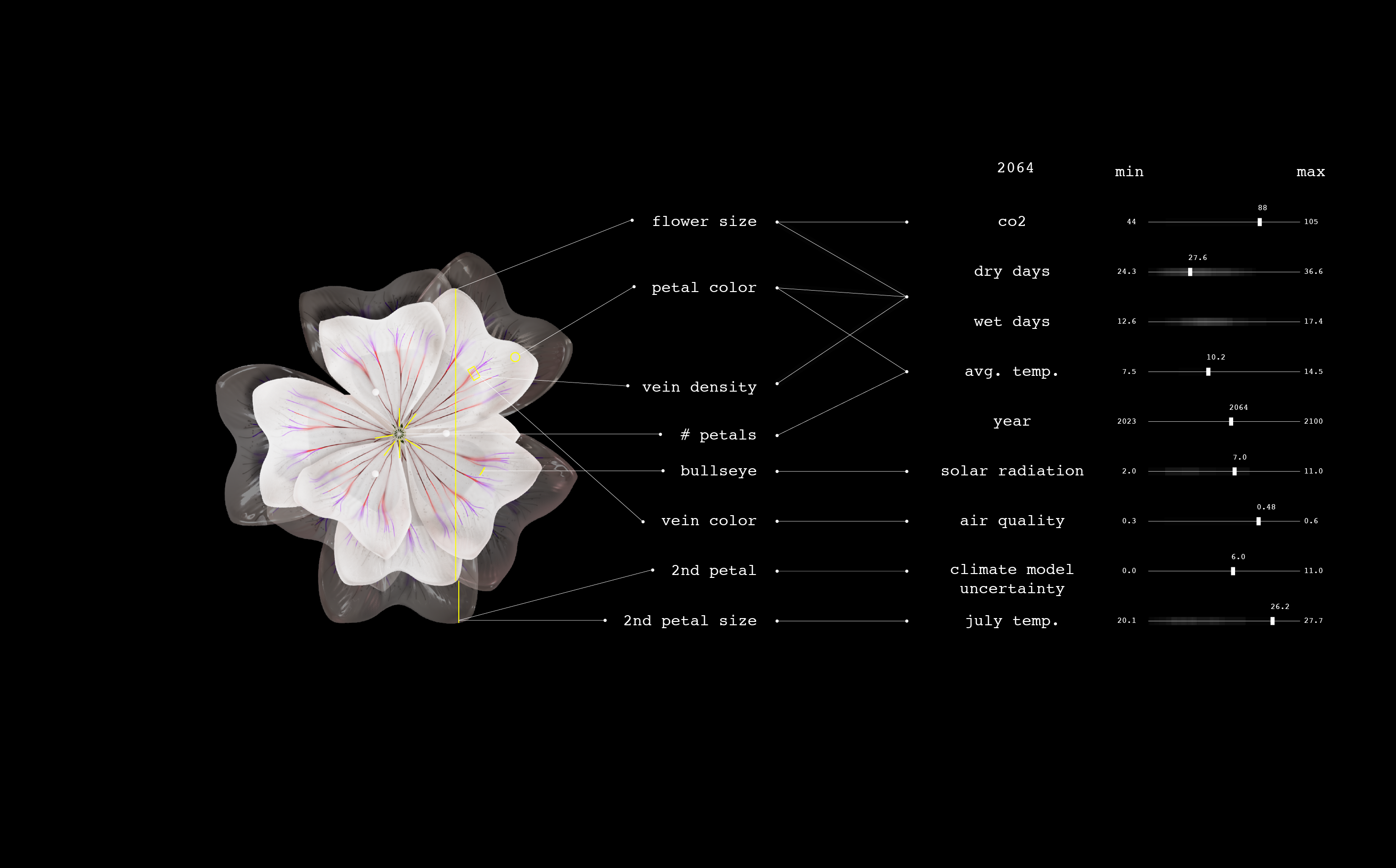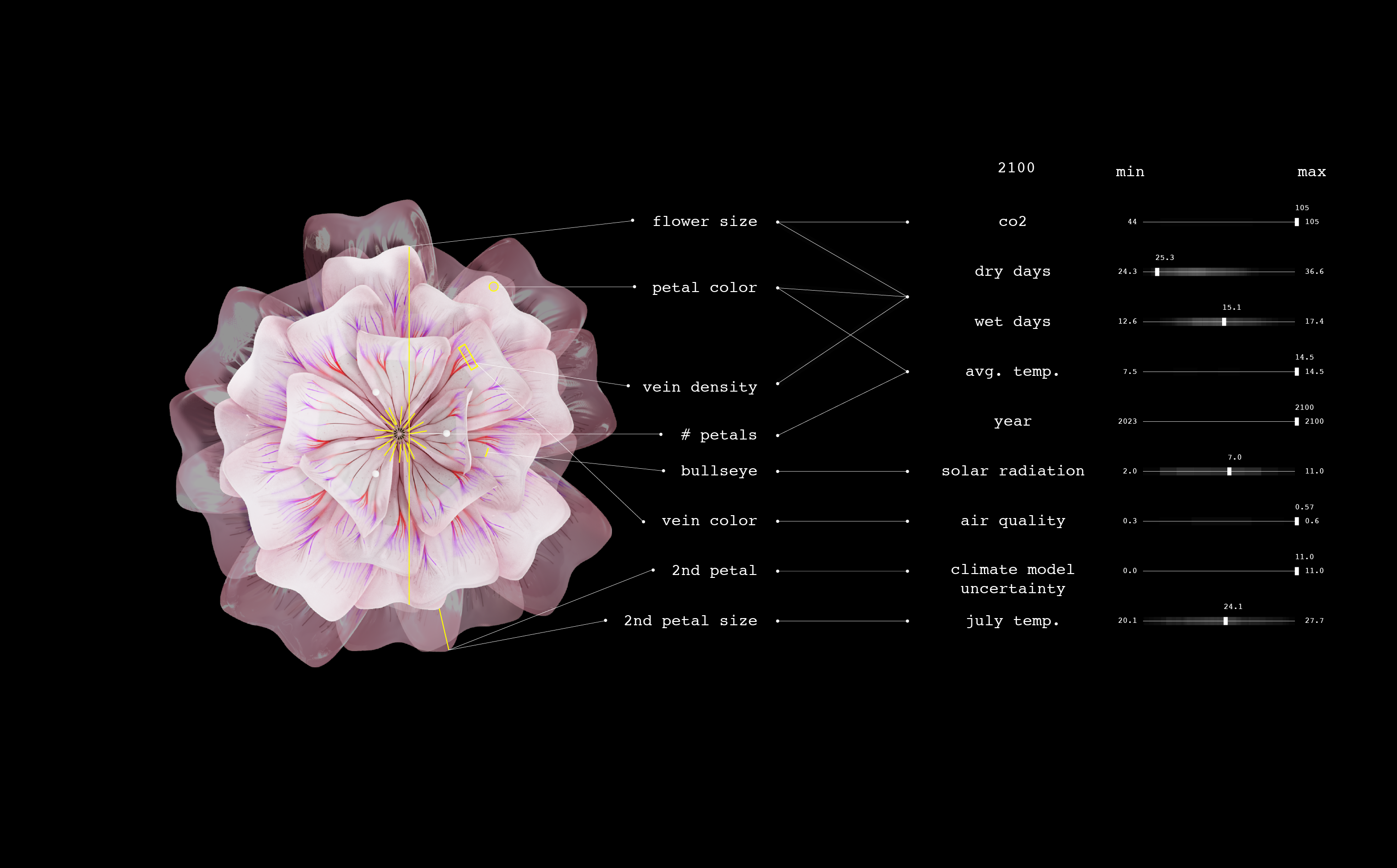 「Plant Futures(プラント・フューチャーズ)」と呼ばれる芸術的研究プロジェクトは、2023年から2100年にかけて、単一の花の種が気候変動にどのように適応・進化するかを想像し、温暖化する世界の複雑かつ長期的な影響について、私たちに思索を促している。このプロジェクトでは、2023年から2100年までの各年に対応する花を1つずつ制作した。各花の形状は、気候予測と気候が花の視覚的属性に与える影響に関する研究に基づく、データ駆動型の設計となっている。